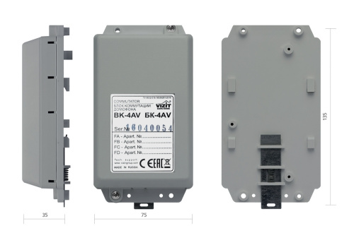 Этажный коммутатор (емкость до 4 абонентов). Встроенный разветвитель видео сигнала предназначен для подключения до 4-х мониторов к линии видеосигнала многоабонентского видеодомофона. Подключение к защитному занулению.